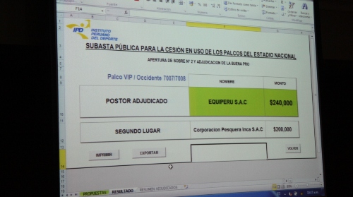 Los 3 Palcos Premium Occidente se adjudicaron a Pablo Delgado Zegarra Ballón (122,000), Universidad San Ignacio de Loyola S.A. (115,000) y Corporación Pesquera Inca S.A.C. (102,000).