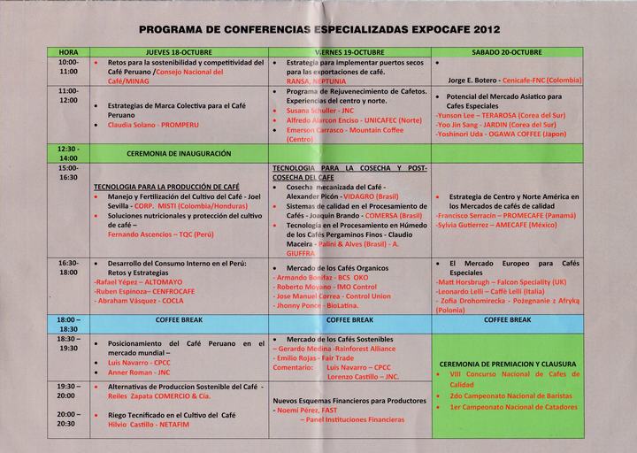 EL Sr. Ministro   de Comercio  Exterior y Turismo, José Silva Martinot   Inauguró Expo Cafe 2012, la  que  se realizará del 18 al 20 de octubre en el  Centro de Exposición  El Vivero  en el Jockey Club   Esta feria  cuenta con la presencia de productores de café, que  durante los 3 días se realizarán conferencias especializadas con expositores  nacionales e internacionales, asimismo se llevará a cabo  el 1er Campeonato Nacional de Catadores de,Show de Barismo,  y el 2do Campeonato Nacional de Baristas.
