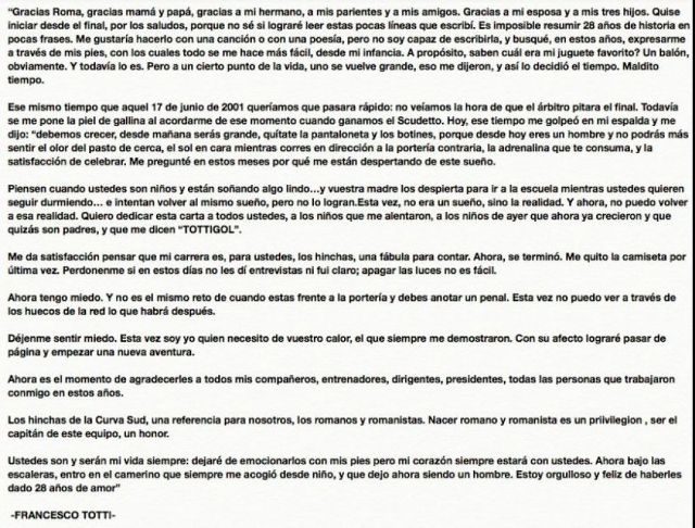 Carta de Totti en su despedida de la Roma (Foto: Twitter):