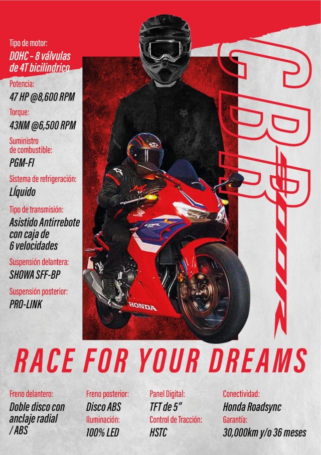 Esta motocicleta deportiva de la marca japonesa, ofrece un moderno motor bicilíndrico de 471c.c., inyección electrónica y refrigeración líquida que desarrolla la máxima potencia de 47HP a 8,500 rpm y torque de 43NM a 6,500 rpm. Asimismo, ofrece una buena aceleración y velocidad máxima de 170 km/h aproximadamente, frenos ABS, Honda RoadSync