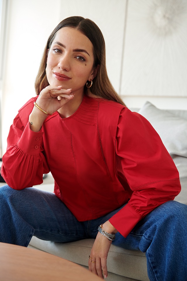 Esta blusa roja de manga larga con hombreras y un diseño calado es la opción ideal para quienes buscan añadir un toque de pasión y elegancia a su atuendo. Perfecta para ocasiones especiales o para elevar un look cotidiano.