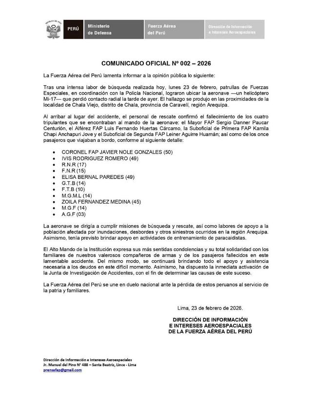 Lima, 23 de Febrero del 2026.- Toda la tripulación y pasajeros del Helicóptero Mi-17, que fue declarada desaparecida el domingo 22 de Febrero tras haber perdido contacto radial, falleció tras ser hallada esta mañana la citada aeronave en la provincia de Caravelí, región Arequipa, informó la Fuerza Aérea del Perú (FAP).