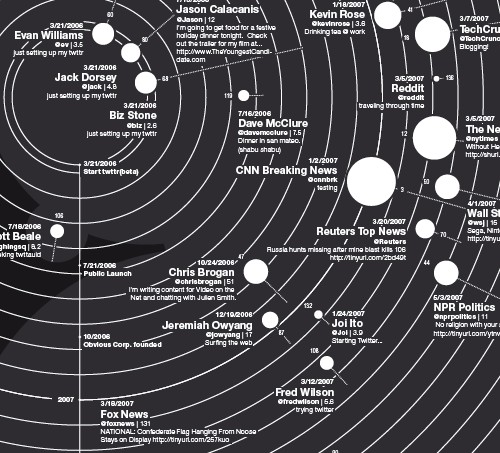 El estudio fue realizado por la compañía Internet Architects que trató de responder a la interrogante de quiénes eran los más influyentes. Para ello, esta compañía analizó una ingente cantidad de datos como el ritmo de actualización de los usuarios de twitter, la cantidad de retwitteos y el número de seguidores. En el centro figuran los usuarios que escriben más tweets representados por un punto.