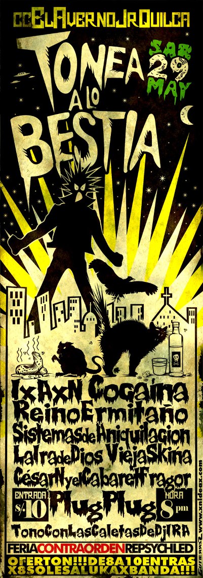 El renovado Centro Cultural El Averno abre sus puertas nuevamente para acoger a lo más diverso de los sonidos que habitan nuestras calles. Las músicas que no vas a escuchar en otro lugar, a menos que estés atento. Para que tonees a lo bestia! Los Plug Plug, luego del lanzamiento de su nuevo video Therapy, estrenan temas de próxima producción http://www.youtube.com/watch?v=BuYu0nxG-cw http://www.myspace.com/losplugplug La Ira de Dios, […]