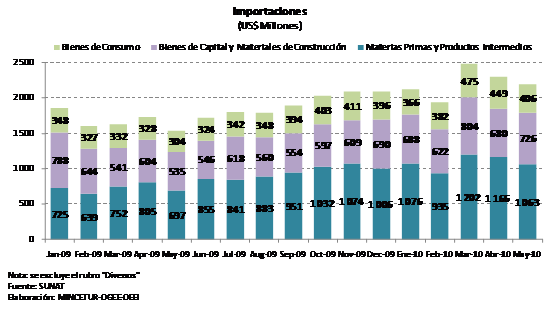De acuerdo con la Oficina General de Estudios Económicos del Ministerio de Comercio Exterior y Turismo (MINCETUR), en mayo de 2010 las importaciones ascendieron a US$ 2.195 millones, monto que representa un incremento de 43% con respecto a similar mes de 2009. En dicho periodo las importaciones de Bienes de Consumo (US$ 406 millones) se […]