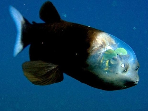 Este extraño pez duende del Pacífico fue visto por primera vez en 2004. Se lo había identificado muerto con anterioridad cuando lo encontraron atrapado en una red de pescadores. Las esferas verdes son sus ojos. Estos apuntan hacia arriba para ver a su presa a través de su cabeza transparente.