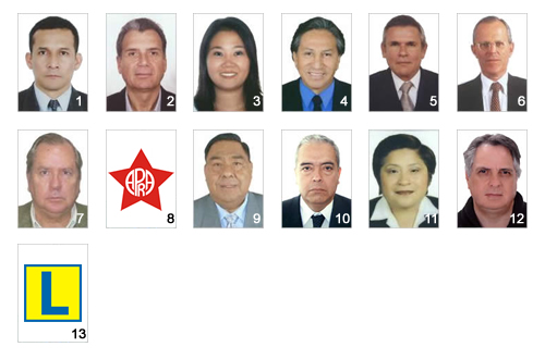 Perú Posible, de Alejandro Toledo; Solidaridad Nacional, de Luis Castañeda; y la Alianza para el Gran Cambio, de Pedro Pablo Kuczynski, aparecerán en el cuarto, quinto y sexto lugar.