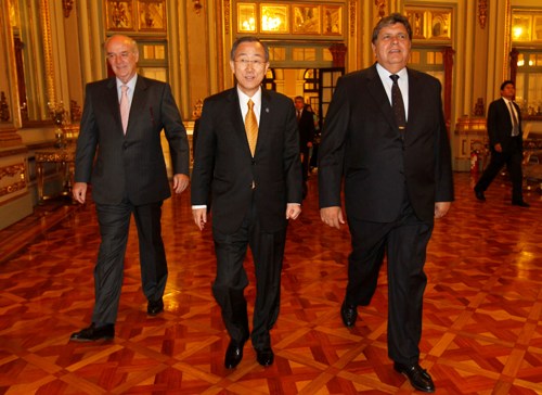 El jefe del Estado, Alan García Pérez, se reúne con el secretario general de la Organización de Naciones Unidas (ONU), Ban Ki-Moon, en Palacio de Gobierno, en el marco de la Visita Oficial que este último realiza al Perú.