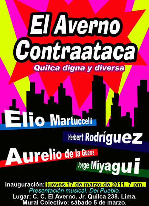 El Centro Cultural el Averno desde sus inicios ha apostado por las manifestaciones artísticas de un Perú diverso, pluricultural y multilingüe, interveniendo el espacio público como un lugar para construir memorias, sentidos de pertenencias, identidades y ciudadanía ampliada. En esta oportunidad, y, en el marco de la Campaña para impulsar el PROYECTO QUILCA BULEVAR DE LA DIVERSIDAD, el Centro Cultural El Averno presenta la exposición El Averno Contraataca, con intervenciones de los reconocidos artistas Herbert Rodríguez, Elio Martuccelli, Aurelio de la Guerra y Jorge Miyagui.