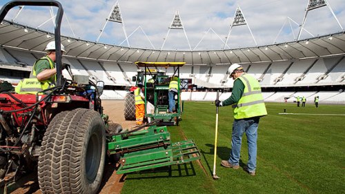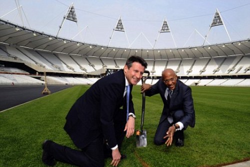 El excorredor británico Sebastian Coe, presidente del comité organizador, colocó simbólicamente la última porción de césped de la grama del estadio, acompañado por el excampeón mundial de los 200 metros lisos Frankie Fredericks, de Namibia.