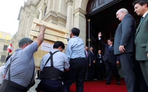 Las piezas arqueológicas de Machu Picchu devueltas al Perú por la Universidad de Yale llegan a Palacio de Gobierno y son recibidas con honores por el presidente de la República, Alan García Pérez, y el pleno del Consejo de Ministros en Palacio de Gobierno.
