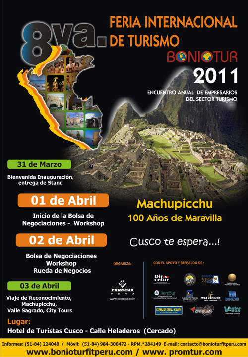 Este 31 de marzo 1 y 2 de abril del presente año, se dará inicio a la 8va. Feria Internacional de Turismo BONIOTUR 2011, en los salones de eventos del Hotel de Turistas Cusco.