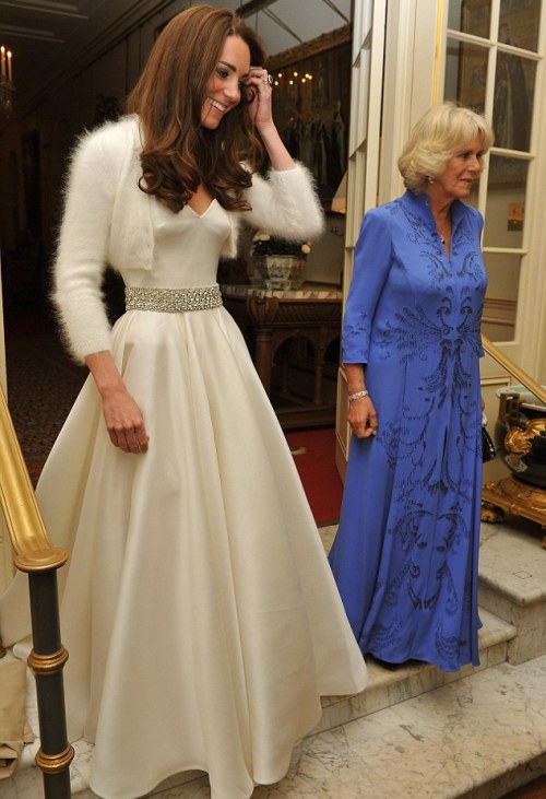 Kate Middleton dejó su vestido de novia y eligió otro diseño de Sarah Burton -que trabaja para la firma del fallecido modisto Alexander Moqueen-: un vestido de noche blanco satén con una falda circular adornada con brillantes bordados en torno a la cintura.
