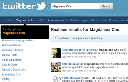 A los pocos segundos de que Magdalena Chu, en representación de la ONPE, diera a conocer los resultados de las elecciones al 18% su nombre se convirtió en Trending Topic Mundial gracias a los comentarios de los tuiteros peruanos que mostraron su malestar por mostrar los resultados a un bajo porcentaje.