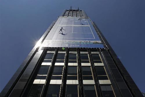 Es tenis, pero con otro ángulo, 90 grados para ser preciso. La pista está en vertical, colgada a más de 60 metros de altura en la pared de la sede de Mutua Madrileña en el paseo de la Castellana.
