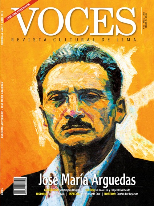 José María Arguedas, el notable escritor andahuaylino, es el personaje que ilustra la portada de VOCES, Revista Cultural de Lima, al cumplirse el centenario de su nacimiento. En la edición número 44 de la revista –la primera del 2011– recordamos pasajes de su vida, su muy difundida obra como “Todas las Sangres” o “Yawar Fiesta”. Folclorista, antropólogo, narrador, y un intelectual profundamente preocupado por la problemática nacional, es un autor de permanente vigencia. La imagen que acompaña la portada es un trabajo preparado el óleo por el artista plástico Bruno Portuguez.