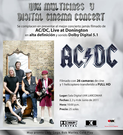 Digital Cinema Concert y UVK Multicines se complacen en presentar AC/DC Live At Donington, la mejor presentación jamás filmada de la banda en todo su esplendor, los días jueves 2, viernes 3 y sábado 4 de junio en UVK Multicines Larcomar.