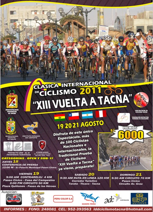 La Liga Deportiva de Ciclismo de Tacna, la Federación Deportiva Peruana de Ciclismo y el Consejo Regional del Deporte de de Tacna, organizan la competencia de Ciclismo de Ruta Clásica Internacional de Ciclismo “XIII Vuelta a Tacna 2011”, que se realizará los días 19, 20 y 21 de agosto del 2011, en la ciudad de […]