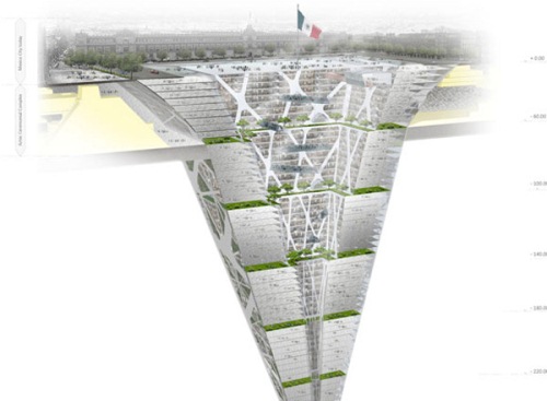 Sería lo contrario a un rascacielos. El proyecto consiste en una torre cónica de 300 metros de profundidad por debajo de la superficie que albergaría 65 pisos.