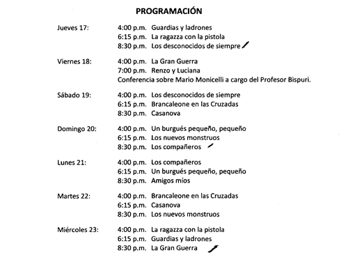 El presente homenaje cuenta con una selección de películas procedentes de la filmografía de Monicelli, así como con una conferencia a cargo del profesor Ennio Bispuri sobre la obra del cineasta, la cual se llevará a cabo el viernes 18 a las 7.00 p.m. después de la función de “Renzo y Luciana”.