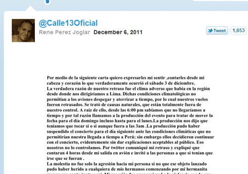Calle 13 escribe carta a peruanos via Twitter