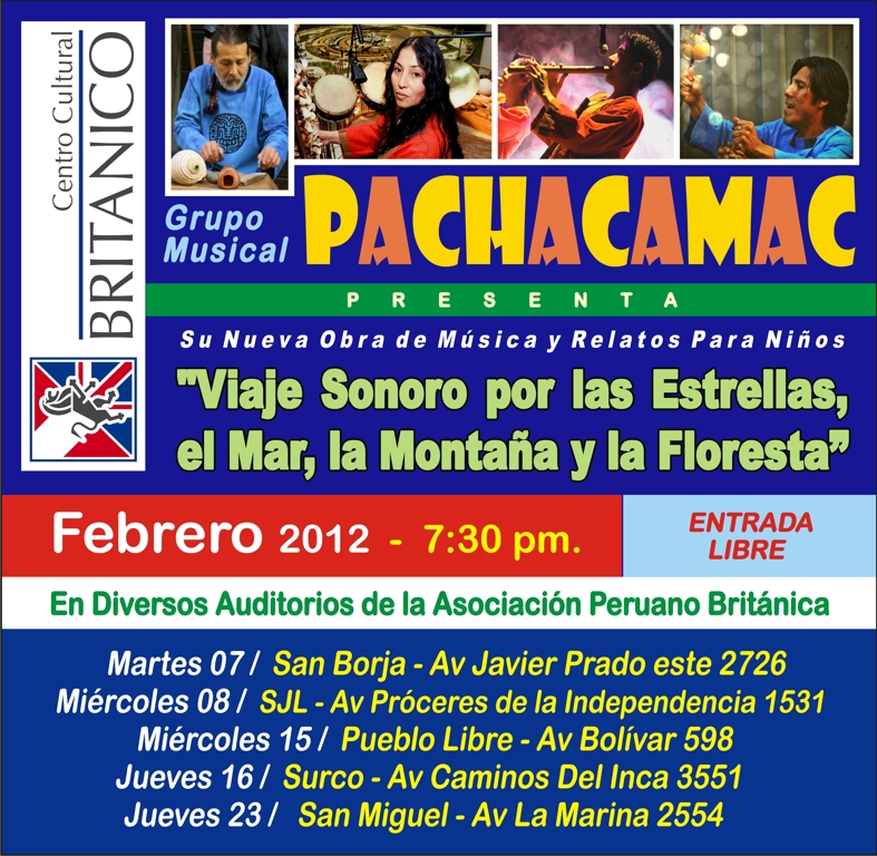 El grupo musical Pachacamac presenta su nueva obra de cuentos y música para niños con instrumentos ancestrales y mestizos del Perú, que incluye relatos musicalizados, temas instrumentales, en una propuesta que nos llevará por un viaje sonoro a través de historias mágicas como: Quismique y el Mar, el Pueblo del Desierto, y el Origen de los Animales.