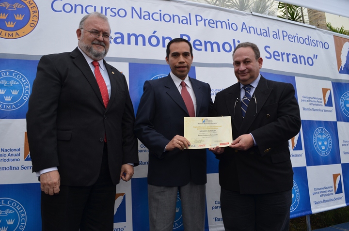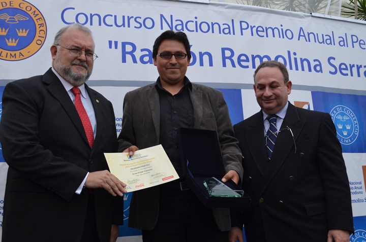 La Cámara de Comercio de Lima entregó los premios a los periodistas ganadores del VII Concurso Periodístico “Ramón Remolina Serrano” “Capital Humano: Pieza fundamental para el desarrollo nacional”, el Ingeniero Samuel Gleiser, presidente de la Cámara de Comercio condecoró al periodista Raúl Vargas Director de noticias de radioprogramas del Perú.