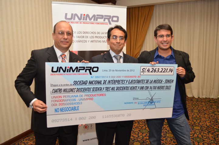 De esta manera, fueron reconocidos en una ceremonia especial los productores fonográficos de Sabor y Control con S/. 27,261.34 nuevos soles, Bareto S/. 25,300.45, Orquesta N´Samble S/. 13,718.56, Gianmarco S/. 13,034.79, Los Terapeutas del Ritmo S/. 11,415.74, Dilbert Aguilar S/. 10,954.45, Orquesta Candela S/. 9,588.09, Orquesta La Novel S/. 7,568.97, y Eduardo del Perú S/. 3,246.34, quienes recibieron el pago de sus regalías fonográficas correspondientes al periodo enero a octubre 2012.