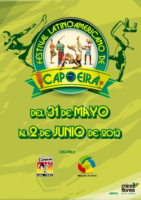 La Embajada de Brasil en Perú y el grupo Candeias, organizan en Miraflores, del 31 de mayo al 2 de junio, el I Festival Latinoamericano de Capoeira. La Capoeira es un patrimonio cultural brasileño, que comenzó como una práctica de juego y lucha de los africanos y criollos esclavizados y se ha convertido en un deporte que hoy día se practica en los cinco continentes, por jóvenes de ambos sexos y diferentes clases sociales.