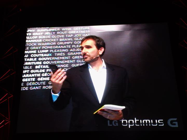 El LG Optimus G es un Smartphone Android que intentará competir con el Samsung Galaxy S III. Posee una pantalla de 4.7 pulgadas True HD IPS LCD con matriz RGB y resolución de 768 x 1280 pixels. Además, posee un procesador quad-core Snapdragon S4 Pro a 1.5GHz, 2GB de RAM, cámara de 13 megapixels trasera y cámara frontal para video chats, junto con una batería de 2100mAh y Android 4.0 ICS.
