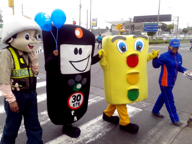 Los muñecos “Semaforito”, “Polito” y “Topecito” estuvieron hoy viernes desde las 7 y 30 de la mañana, orientando a los peatones sobre el respeto a las normas de tránsito, dentro de la campaña se seguridad vial que realiza permanentemente la Municipalidad del Callao y el Consorcio Tránsito Ciudadano, teniendo en cuenta que según estadísticas 4 de 5 muertos en accidentes de tránsito son peatones.