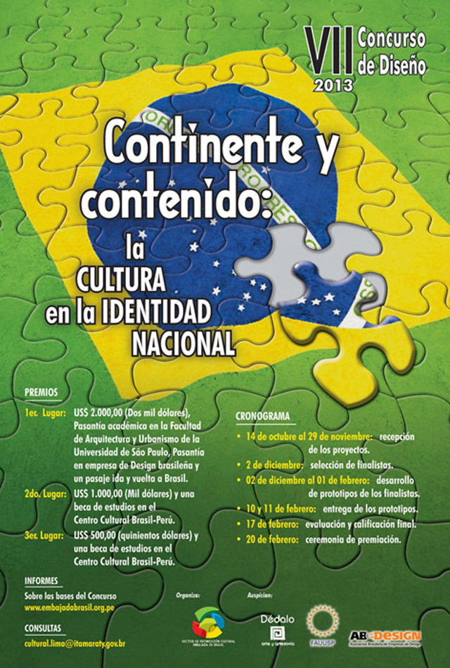El sector cultural de la Embajada de Brasil en el Perú anuncia la convocatoria a su VII Concurso de Diseño, cuyo tema este año es “Continente y contenido: La Cultura en la Identidad Nacional”, dirigido a diseñadores peruanos y extranjeros. Los proyectos pueden ser presentados hasta el 22 de noviembre.