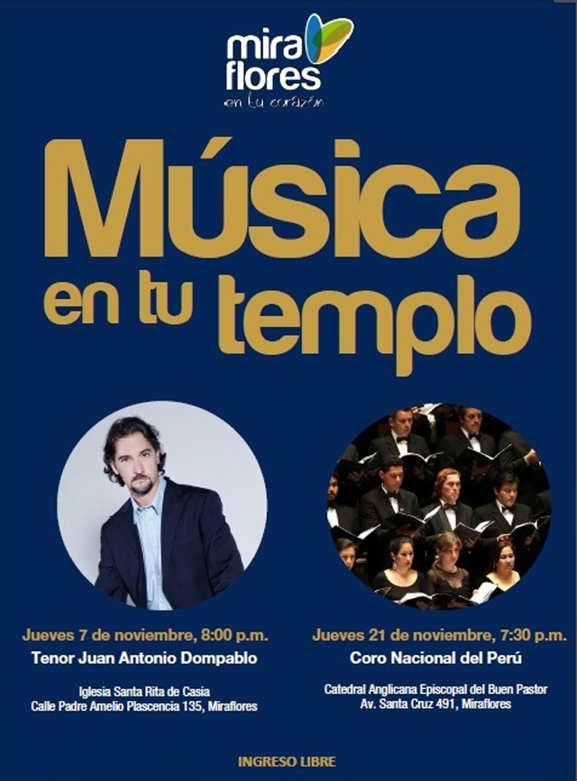 La Municipalidad de Miraflores se complace en invitar al primer recital de noviembre de MÚSICA EN TU TEMPLO, un programa que en esta oportunidad tiene como invitado al destacado tenor Juan Antonio de Dompablo.