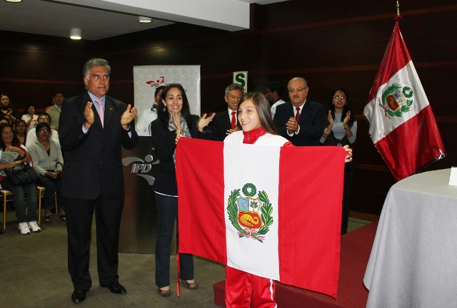 Francisco Boza hizo entrega de la bandera nacional, a la destacada nadadora Ariana Rondón Arana, quien agradeció tan alta distinción. “Es un honor y una gran responsabilidad representar a nuestro país”, manifestó Rondón.