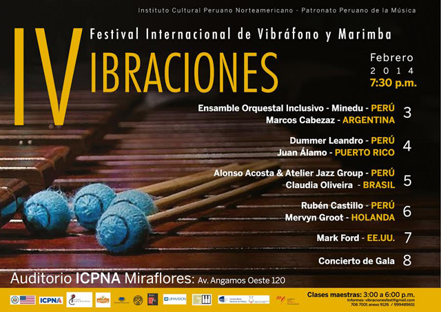 El ICPNA, con el apoyo del Patronato Peruano de la Música, presenta el festival que en una nueva edición consolida un espacio primordial en el ámbito de la percusión. Participan representando a Perú el Ensamble Orquestal Inclusivo del Minedu, Dummer Leandro, Alonso Acosta & Atelier Jazz Group y Rubén Castillo, así como los maestros extranjeros Marcos Cabezaz (Argentina), Juan Álamo (Puerto Rico), Claudia Oliveira (Brasil), Mervyn Groot (Holanda) y Mark Ford (EE.UU.). El festival concluye el sábado con un Concierto de Gala a cargo de todos los músicos participantes. Gracias al auspicio de diversas compañías e instituciones y la Embajada de los Estados Unidos de Norteamérica. Coordinador general: Alonso Acosta. Auditorio ICPNA Miraflores. 7:30 p.m. Clases maestras: 3:00 p.m. a 6:00 p.m. Informes e inscripciones: vibracionesfest@gmail.com. / Cel. 999489651.