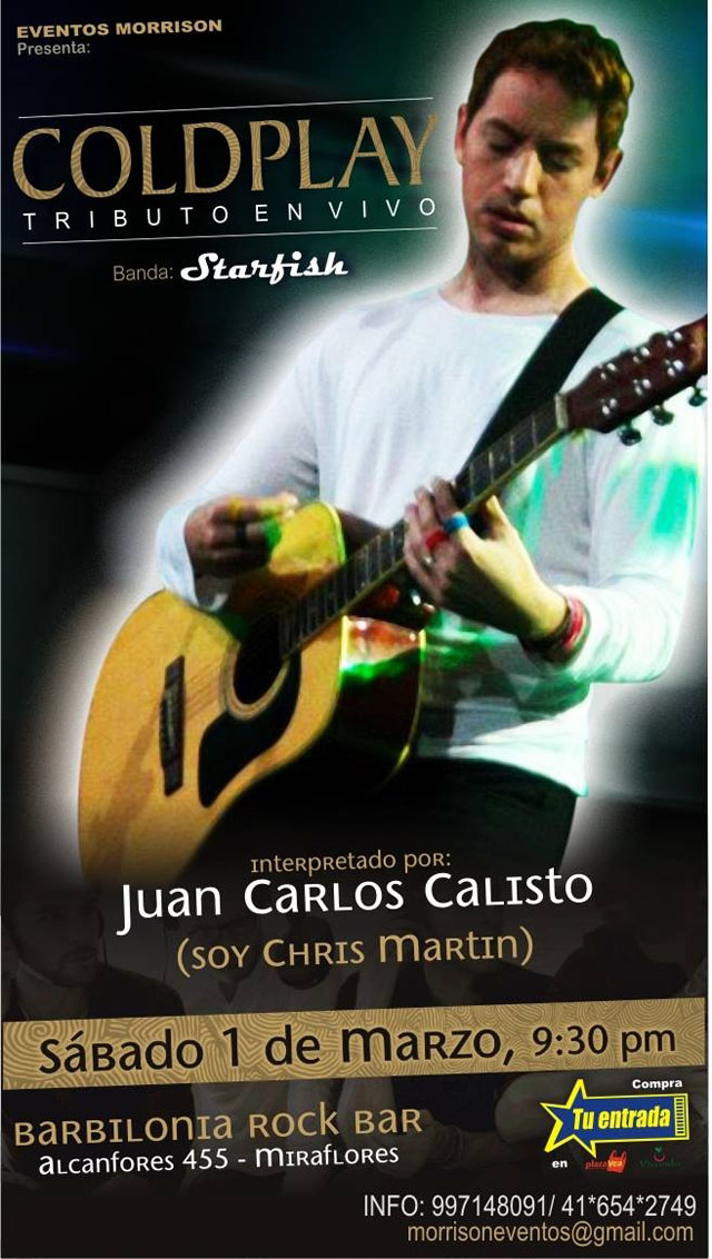 Este será un evento sin precedentes, donde celebraremos el cumpleaños de su gran músico y líder Chris Martin escuchando temas como: “Yellow”, “Trouble”, “Clocks”, “Don’t Panic”, “Speed of sound” entre otros… con la banda nacional “Starfish” en la voz de Juan Carlos Calisto (soy Chris Martin), tal como lo viste en la televisión, junto a la invitada especial Marianelle Mezarina (Soy Alanis Morissette Peruana)