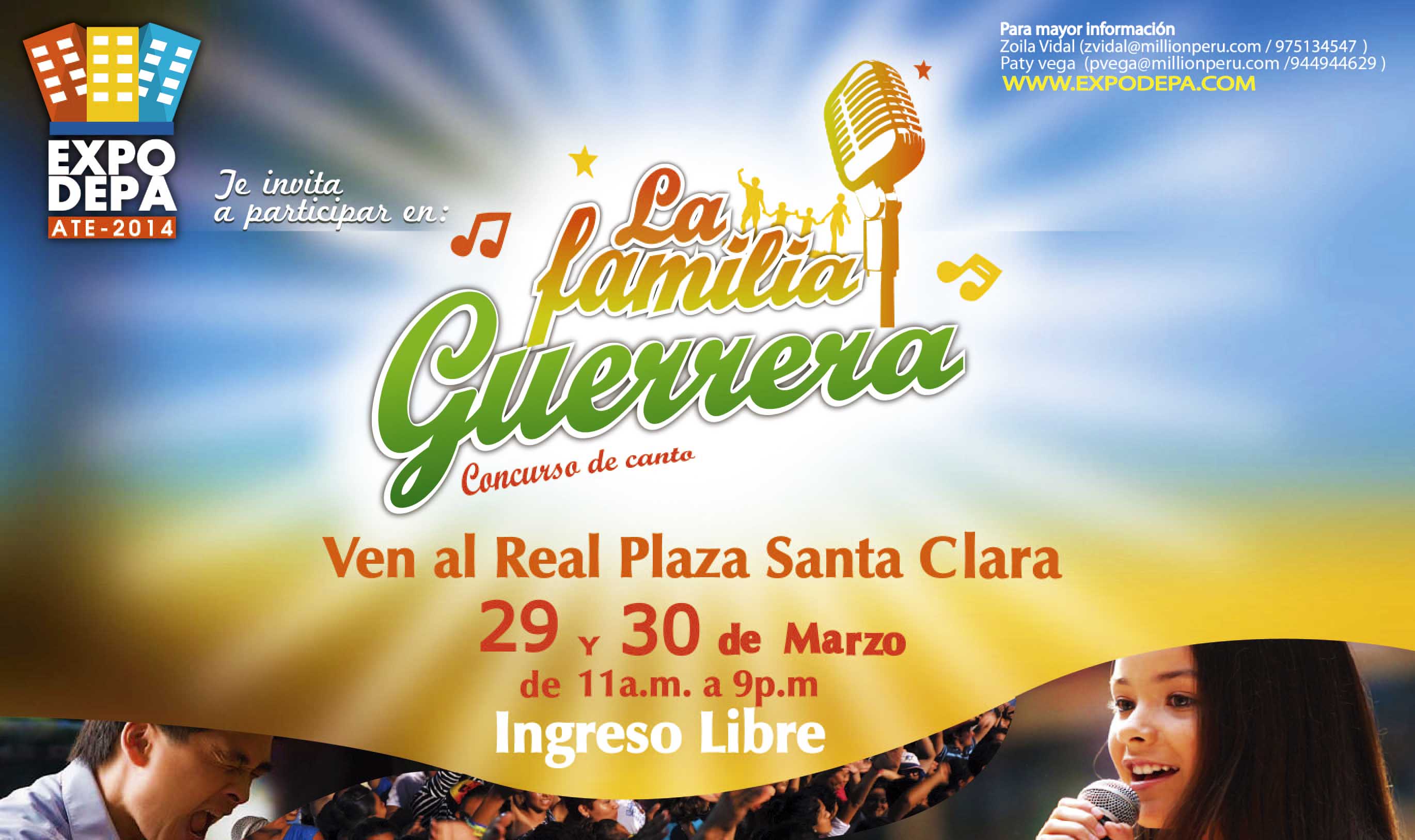 La feria familiar Expodepa Ate que se realizará este 29 y 30 de Marzo del presente en el centro comercial Real Plaza de Santa Clara, estará realizando un casting en vivo con todas las familias asistentes al evento que deseen participar en su concurso de canto “la familia guerrera del Expodepa”. El requisito es que los integrantes sean familiares es decir, que canten entre hermanos, padres o tíos y que sean canciones de cumbia. Esto forma parte de una motivación a las familias guerreras como la familia Guerrero de Corazón Serrano, con este concurso podremos ver nuevas familias que quien sabe se vuelvan muy famosas en el tiempo. Este concurso está auspiciado por Radio Canto Grande y a cargo de la productora Million.