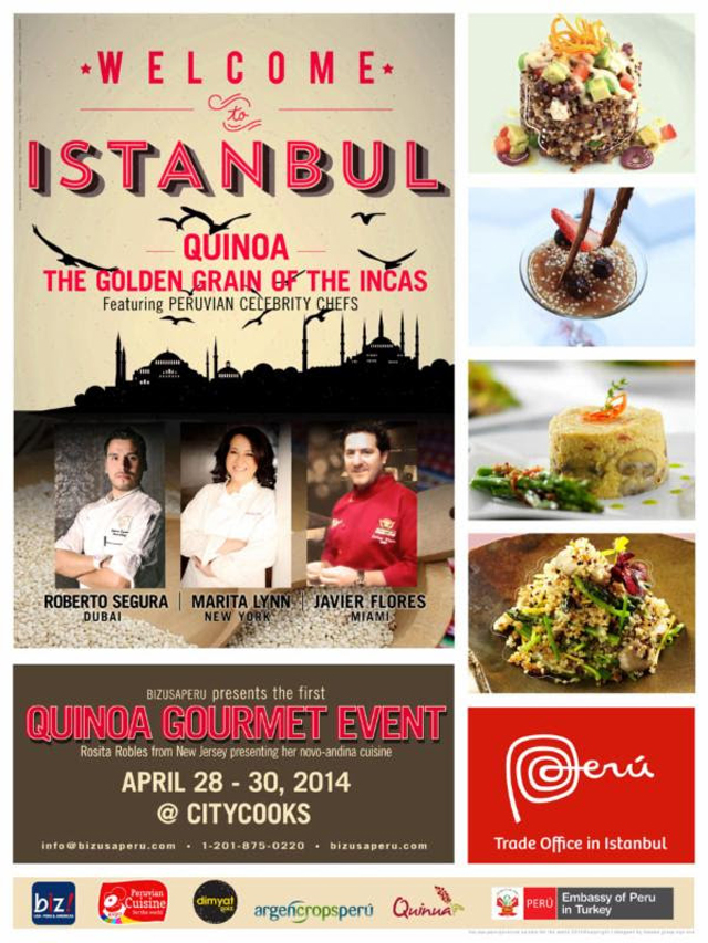 En la escuela CityCooks, cuatro reconocidos chefs peruanos de trayectoria internacional -Roberto Segura, Maryta Lynn, Javier Flórez y Rosita Robles-, que llegarán procedentes de Emiratos Árabes y Estados Unidos exclusivamente invitados a participar en «Quinoa, the Golden Grain of the Incas», enseñarán a casi un centenar de asistentes -entre cocineros gourmet, nutricionistas, estudiantes de gastronomía, empresarios del sector agroexportador, dueños de restaurantes, así como periodistas gastronómicos de Turquía-, la historia milenaria, los valores nutricionales, las oportunidades de negocio y las múltiples aplicaciones de la quinua peruana en la gastronomía turca e internacional.
