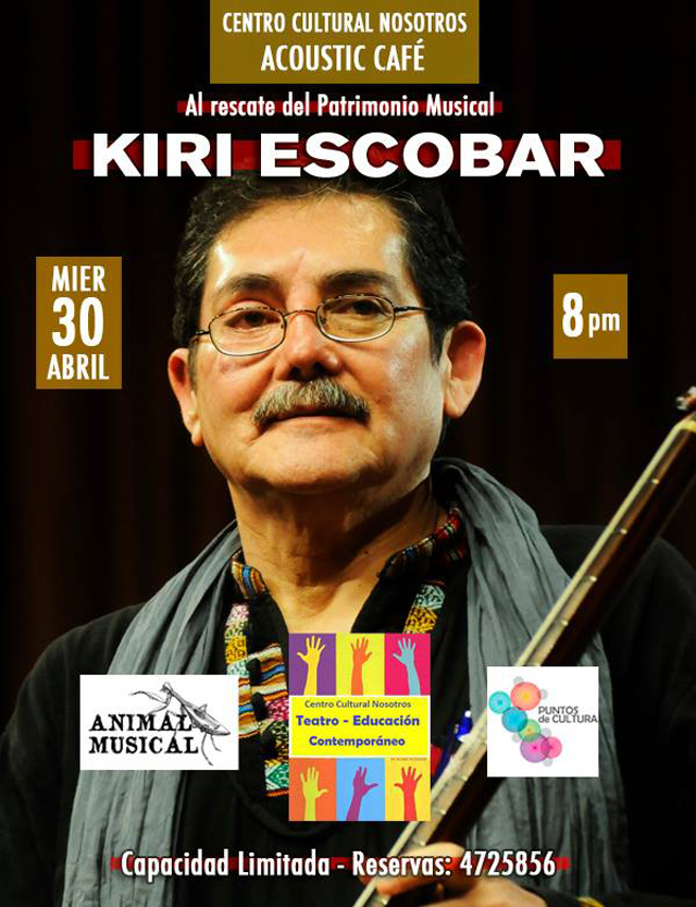 Este Miércoles 30 de Abril, a las 8pm, el Acoustic Café del Centro Cultural Nosotros Teatro/Educación se complace en presentar a uno de los músicos más renombrados de nuestro país, de sensibilidad única, cuyo arte ha recorrido todo el mundo y sus composiciones han sido reconocidas por clásicos de nuestra música como Chabuca Granda y Eva Ayllón. Daniel «Kiri» Escobar, acompañado de su Trío Lundú, nos estará presentando su espectáculo «Canterurías», en una exquisita mezcla de géneros como el vals criollo, el landó y la zamacueca, fusionados con armonías brasileñas y jazzísticas. El público asistente podrá acompañar la velada con un delicioso café, una copa de vino o con los sabrosos piqueos que estarán a disposición en el Café del Centro Cultural.