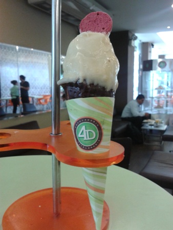 Seguro que ya probaste el helado MACARRÓN de Ana María Bugosen, maestra heladera de la Cafeladería 4D, ahora también podrás deleitarte con su otra presentación en la cual el helado esta bañado de cobertura de chocolate blanco y el cono en cobertura de chocolate. ¡Eso no es todo!!! Disfrutaras de mucho más, ya que el cono está completamente relleno del helado MACARRÓN.