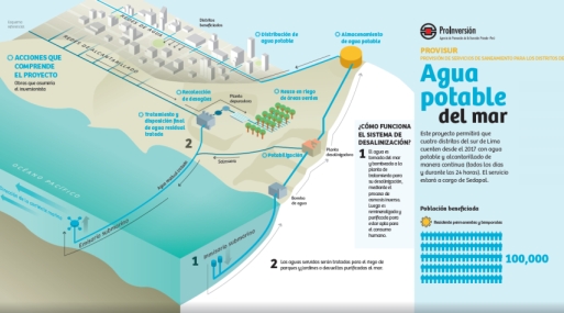 Esta iniciativa apunta a desalinizar el agua de mar de cuatro Distritos del sur de Lima (Punta Hermosa, Punta Negra, San Bartolo y Santa María del Mar), a fin de que cuenten con agua potable y alcantarillado de manera continua.