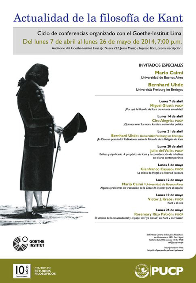 Regresan los lunes filosóficos del Centro de Estudios Filosóficos de la Pontificia Universidad Católica del Perú y el Goethe-Institut Lima. A partir del 7 de abril hasta el 26 de mayo, filósofos peruanos junto con filósofos tan renombrados como Mario Caimi (Universidad de Buenos Aires) y Bernhard Uhde (Universität Freiburg im Breisgau) expondrán aspectos diversos de esta actualidad de la obra filosófica de Kant.