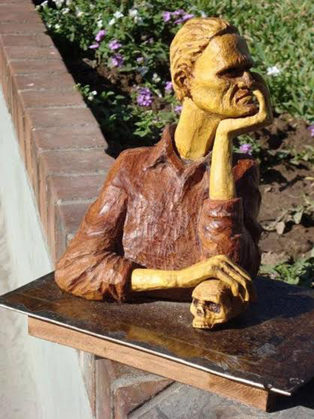 De ahí el nombre de esta exposición, FURTIVO, en referencia de haber sido concebida y realizada en la apacible clandestinidad que brindan las pocas pero sosegadas horas que le ha podido dedicar al taller. Y como consecuencia de mediar entre cada obra largos períodos de obligado silencio creativo y laboral, nos presenta una visión miscelánica, dispersa, variopinta y exenta de unidad conceptual de sus preocupaciones artísticas; en la que prevalece cierto estilo que se expresa sobre todo en el gesto manual, la manera en el golpe de la herramienta contra el material rebelde que da como resultado final la siempre bien acogida recompensa de ver, por fin, la obra terminada.