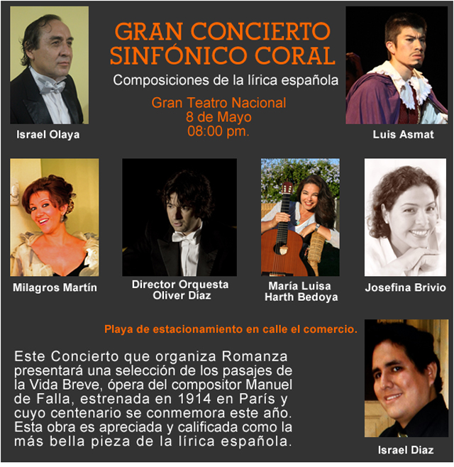 Lima, may. 06. La Asociación Cultural Romanza anunció que este jueves se realizará un concierto sinfónico coral en el Gran Teatro Nacional dando así inicio a la nueva temporada de la asociación.