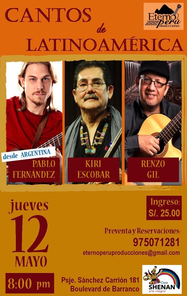 Kiri Escobar, Renzo Gil y Pablo Fernández juntos por primera vez. Estos tres cantores unidos por la Patria Grande, nuestra Latinoamérica, se reunirán el próximo 12 de junio para llenar un escenario limeño con música del Perú, Argentina y América Latina.