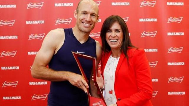 La conductora del programa Día D entregó el galardón al extremo holandés Arjen Robben, quien colaboró con su selección anotando uno de los goles con los que los europeos derrotaron a los “Socceroos” por 3 a 2. Vale destacar que también estuvo presente en el cotejo Christian Gonzáles, niño de 11 años que gracias a Fábrica de Sueños acompañó a uno de los seleccionados mientras estos salían al campo.