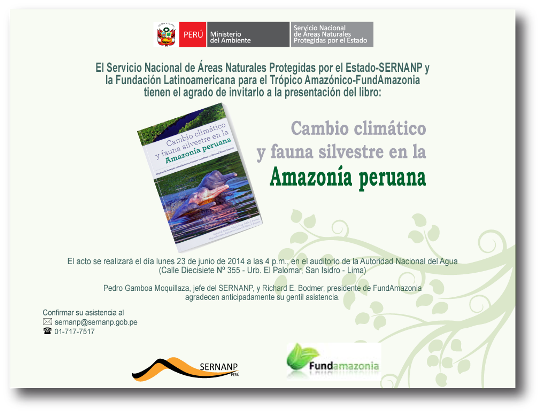 El Servicio Nacional de Áreas Naturales Protegidas por el Estado (SERNANP) y la Fundación Latinoamericana para el Trópico Amazónico (FundAmazonía) presentarán este lunes 23 el libro titulado “Cambio Climático y fauna silvestre en la Amazonía peruana”. La presentación estará a cargo del jefe del SERNANP, Pedro Gamboa Moquillaza y el presidente de FundAmazonía, Richard E. Bodmer.