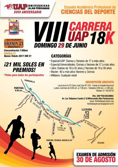 Dentro del marco por sus XVIII aniversario de la Universidad Alas Peruanas, la Escuela Académico Profesional de Ciencias del Deporte, organizará este 29 de junio la Carrera UAP 18k, que tendrá como punto de partida el Restaurant Granja 21 en Cieneguilla y la llegada será en la sede de nuestra escuela.