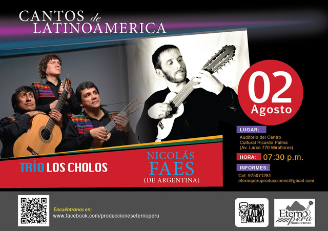 Nicolás Faes y el trío Los Cholos tuvieron un primer encuentro musical en la histórica ciudad del Cusco hace más de 4 años y, por primera vez, se unen en concierto en la c iudad de Lima para el próximo 2 de agosto para una nueva versión de “Cantos de Latinoamérica” que se brinda como los previos a la próxima II edición del festival internacional “Sonamos Latinoamérica” en Perú.