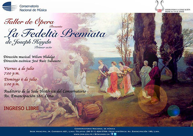El Taller de Ópera del Conservatorio Nacional de Música presenta el primer acto de La Fedeltà Premiata, comedia de Haydn sobre ninfas y pastores que enfrentan una terrible amenaza. Con la dirección musical del profesor Wilson Hidalgo y la dirección escénica de José Ruiz Subauste.